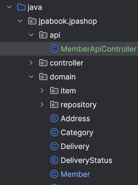 주문(Order): 한번 주문시 여러 상품을 주문 할 수 있으므로, 주문과 주문상품(OrderItem)은 일대다 관계, 주문은 상품을 주문한 회원과 배송정보, 주문 날짜, 주문 상태(status)를 가지고 있다. 주문 상태는 열거형을 사용했는데 주문(ORDER), 취소(CANCLE)을 표현 할 수 있다.