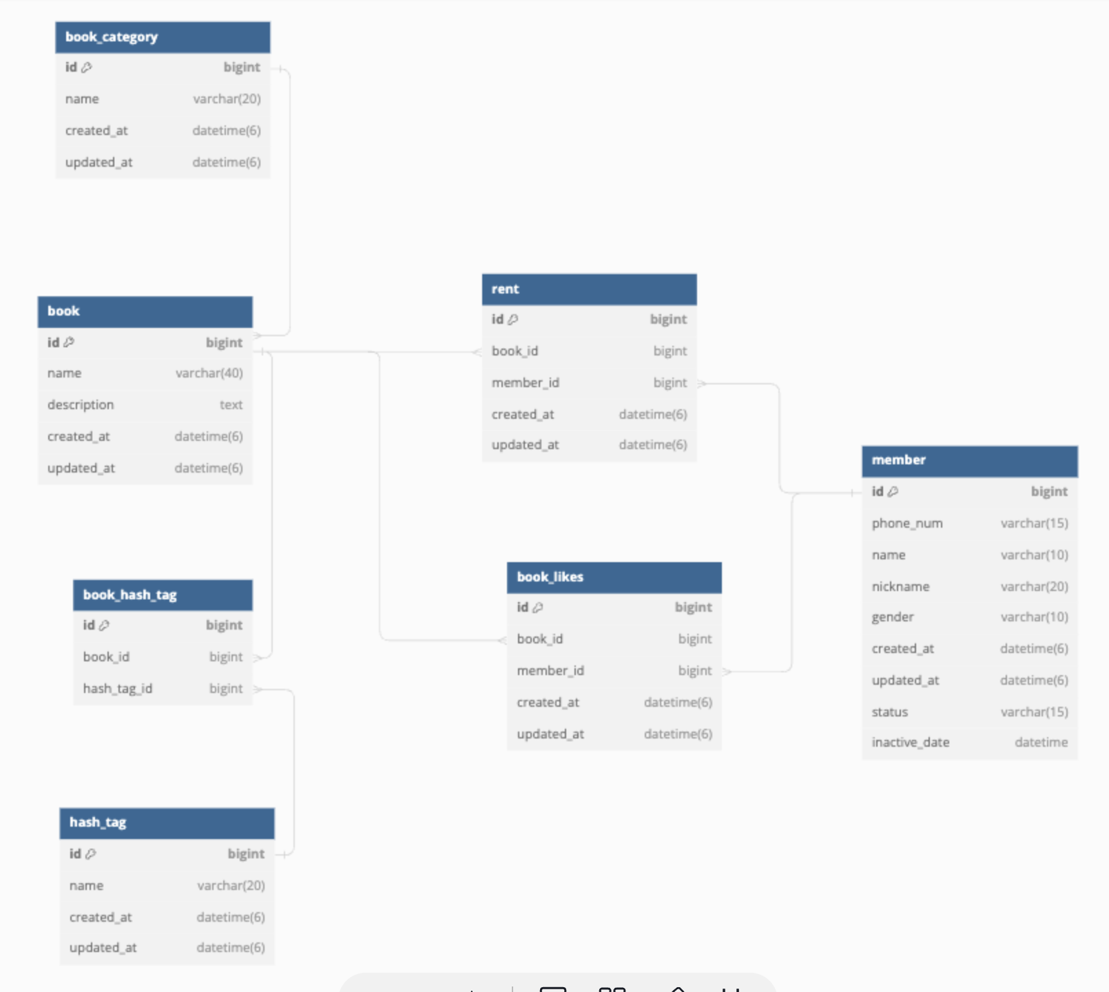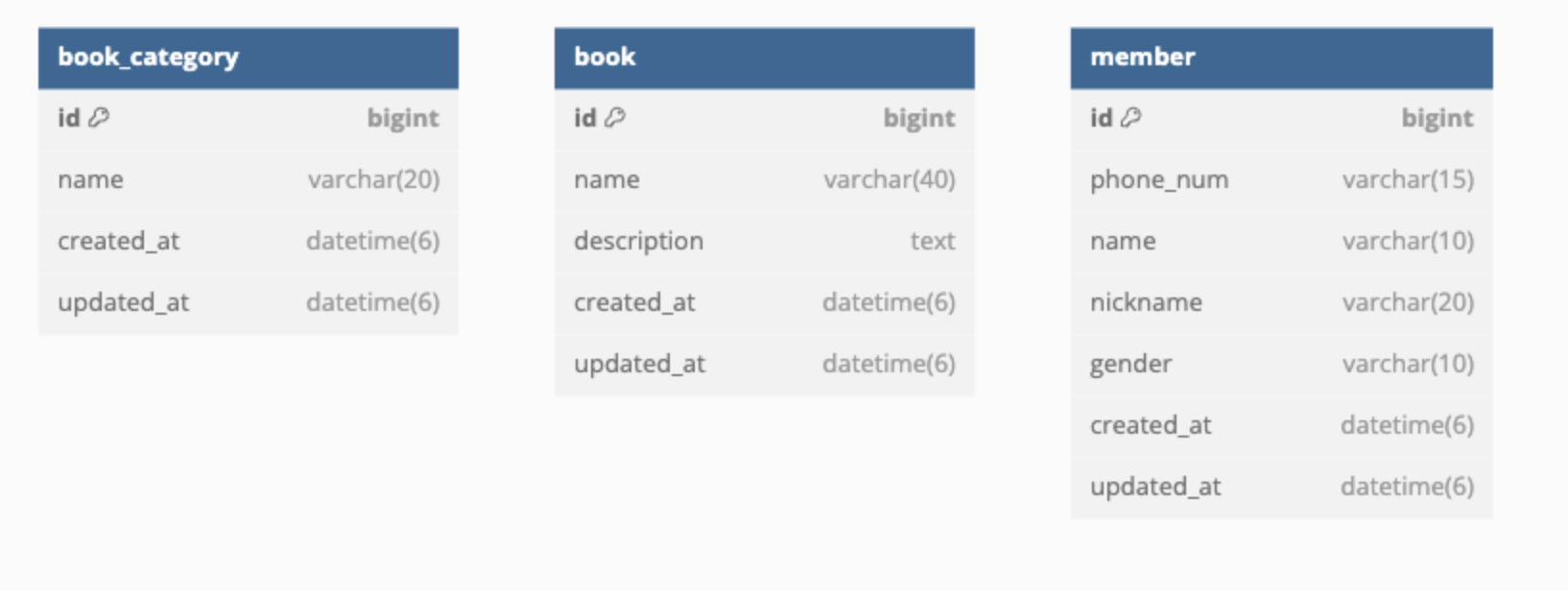 기본 키를 위해 각 엔티티 정보 중 유일한 값을 기본 키로 설정하기 보다는 index를 따로 두는 것이 편합니다, 또한 각 index를 위한 id를 book_id, member_id 이렇게 보다는 그냥 id로 이름을 짓는 것이 좋습니다.