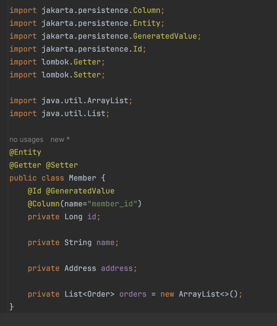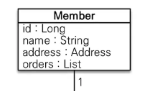 회원(Member): 이름과 임베디드 타입은 주소(Address), 그리고 주문(orders) 리스트를 가진다.