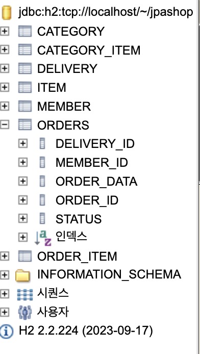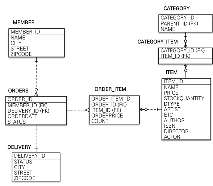 MEMBER: 회원 엔티티의 Address 엠베디드 타입 정보가 회원 테이블에 그대로 들어갔다. Delivery 테이블도 마찬가지