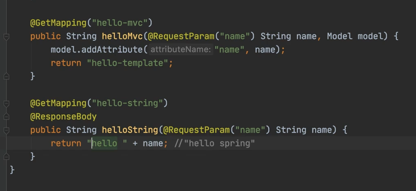 이렇게 보면 스프링에서 서버를 키고 로컬로 들어가서 hello-mvc라는 url로 들어가게되면 밑에 return hello-template에 따라서 리소스에서 저 html파일을 따라가서 거기서 주어진 data를 html과 같이 화면에 띄우는것이라면