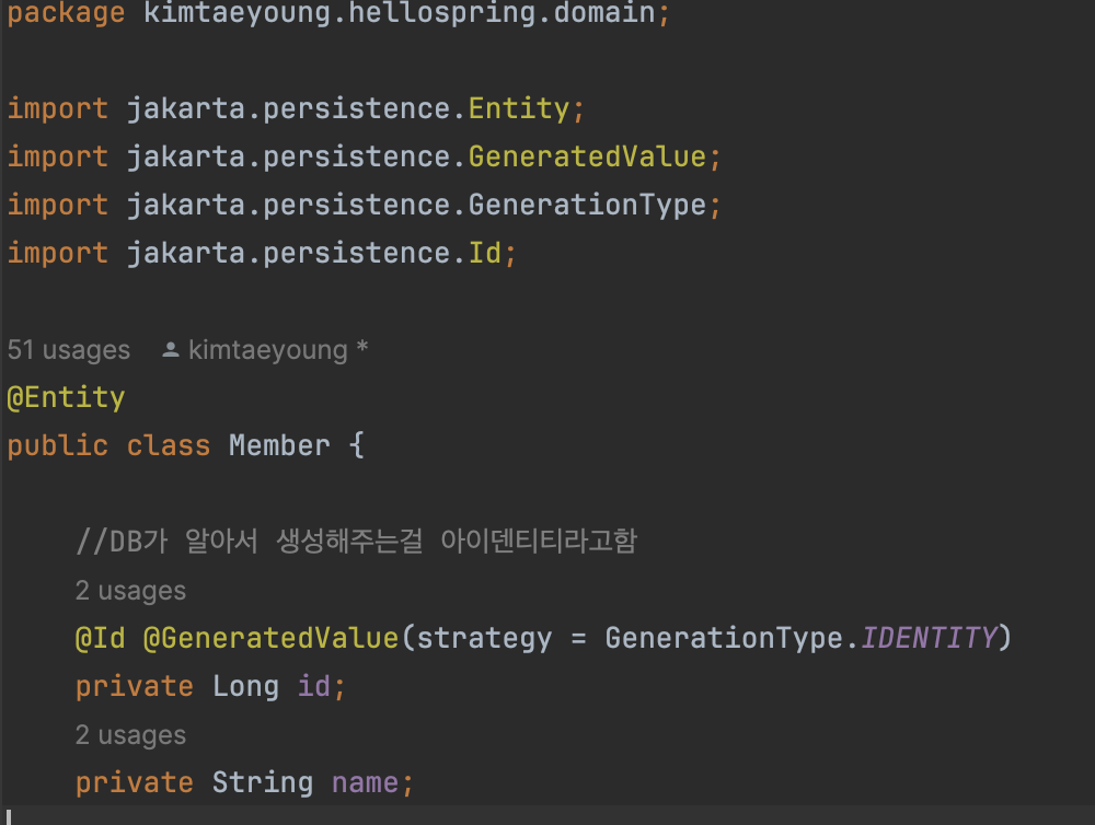 이렇게 멤버 클래스에 엔티티와 아이디 제네레이티드벨류를 추가해줌