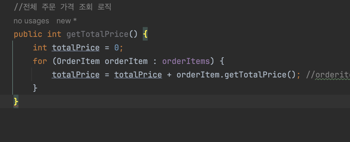 이렇게 for문으로 돌면서 totalprice를 가져와서 더하는 방식으로해야하는 이유는 orderItem 내부에 상품 가격과 주문 수량이 있기때문에 orderItem 클래스 내부에서 그 둘을 곱한 가격을 가져와야한다.