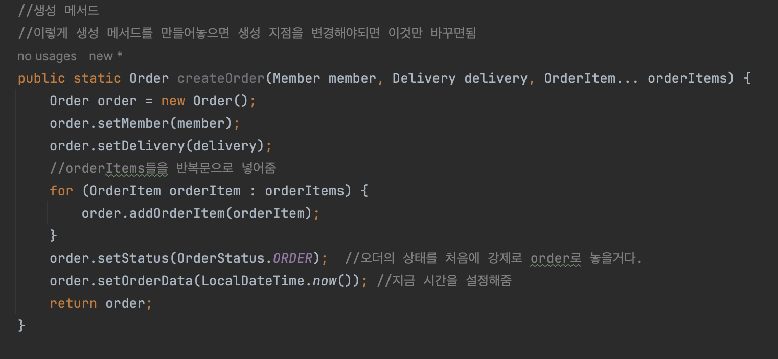 그래서 이렇게 복잡한건 별도의 생성 메서드가 있으면 좋다. 따라서 order 클래스에 생성 메서드를 만들어준다.