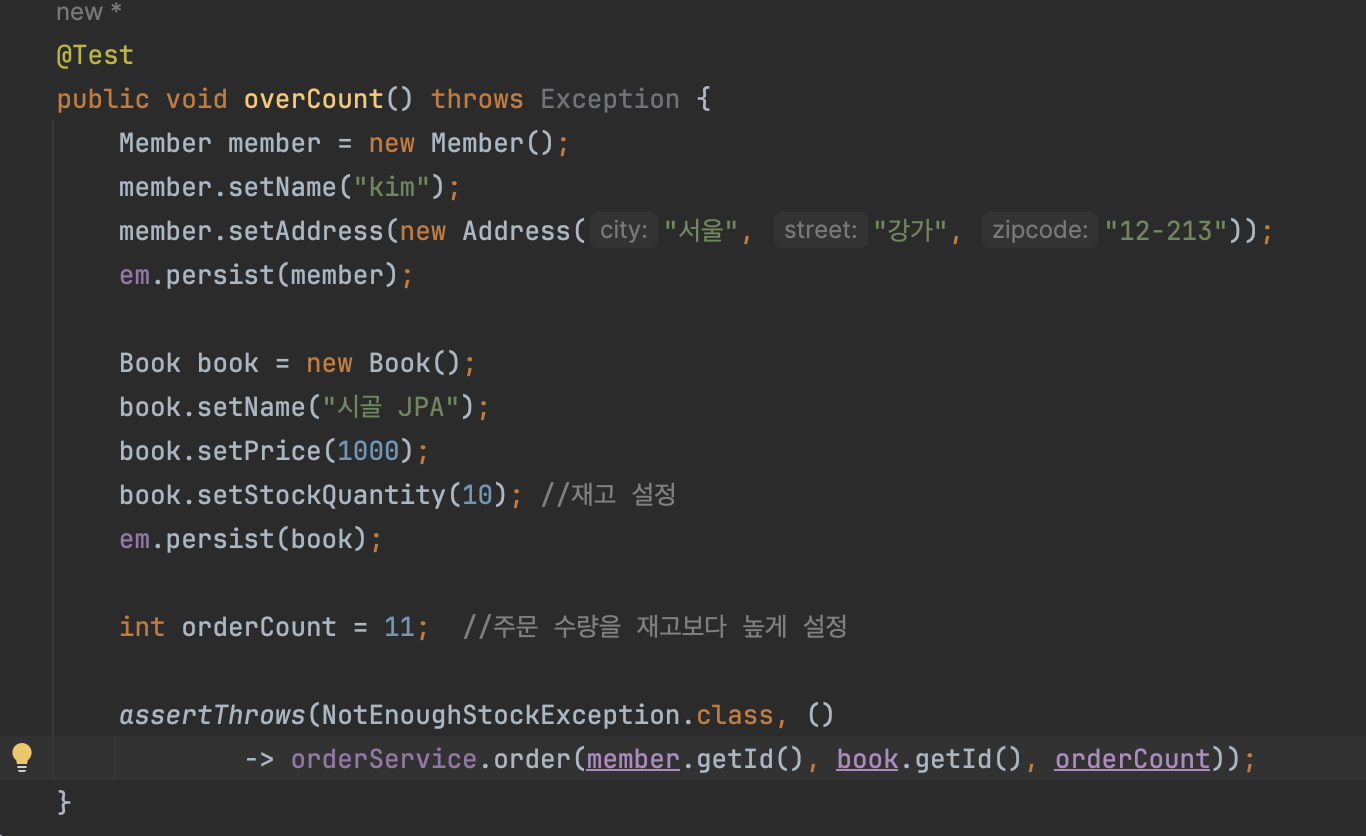 다음은 예외 테스트로 상품 주문 갯수 재고 초과 테스트를 해볼것이다.