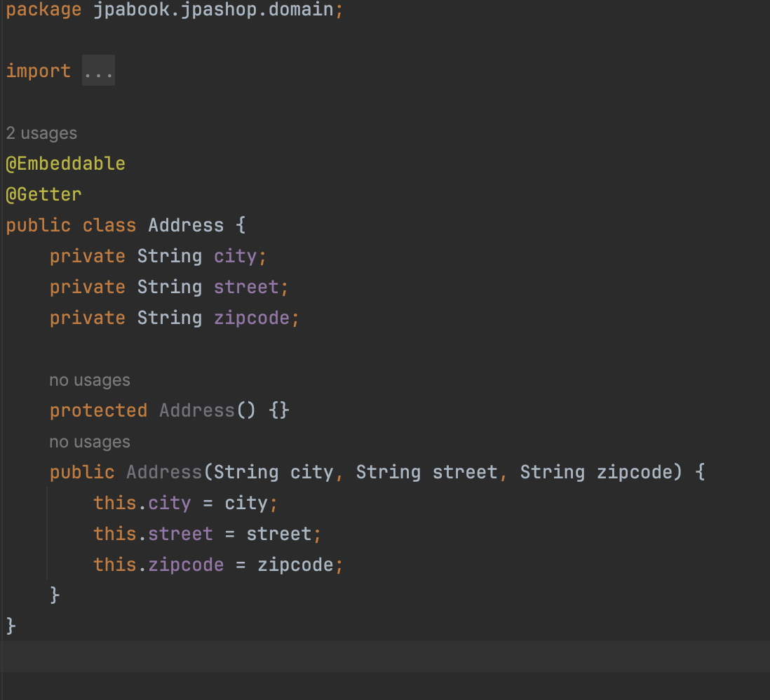 주소(Address): 값 타입(임베디드 타입). 회원과 배송에서 사용된다