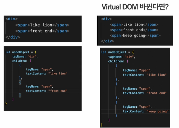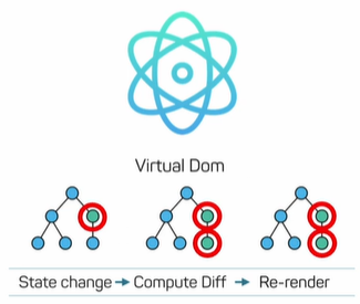 virtual DOM은 어느 부분이 바뀌면 그 바뀐 부분을 바로 반영하지 않고 DIFFING 알고리즘을 통하여 어떤 부분이 달라졌는지 체크를 함. 그리고 그 전과 비교하여 바뀌어진 부분을 RE-RENDER하여 바뀐 부분만 바꿔주는 형식으로 진행이됨.