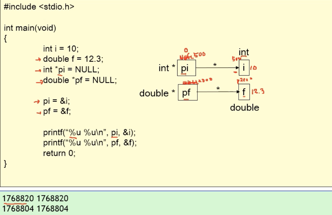 pi에는 i의 주소값이 들어가게됨 근데 이제 *pi를 출력하게되면 i의 값인 10이 나오게됨.