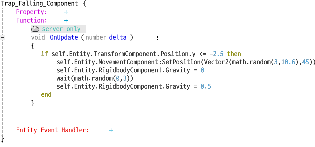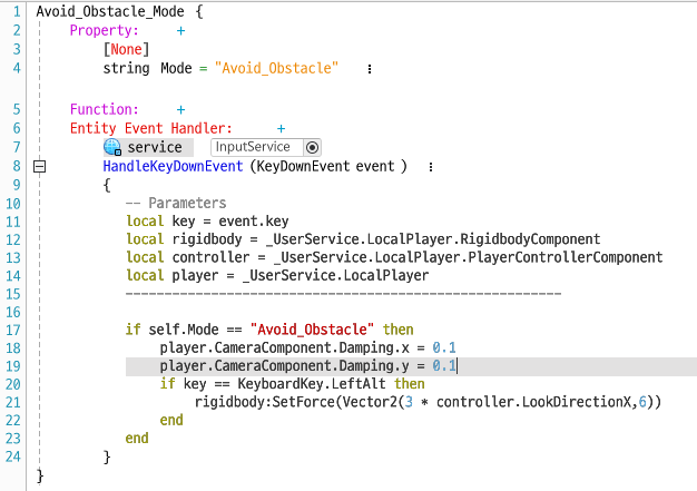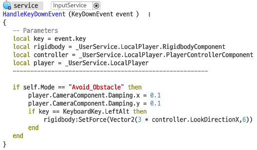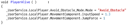 Component의 목적은 공중에서 LeftAlt 키를 누를시 위로 뛰어오르게끔 연출하는 것이므로 위에 Property에서 설정했듯이 Mode = “Avoid_Obstacle” 즉 장애물 피하기 모드일경우에만 해당 처리가 하도록 if문을 통해 만들어주었음. 그 뒤 점프시에 카메라가 바로 따라가줘야 장애물을 보고 피할 수 있으므로_UserService.LocalPlayer.CameraComponent.Damping.x(y) (카메라 반응속도)를 짧게 낮춰 카메라가 플레이어를 빠르게 따라갈 수 있도록 설정해준 코드임.