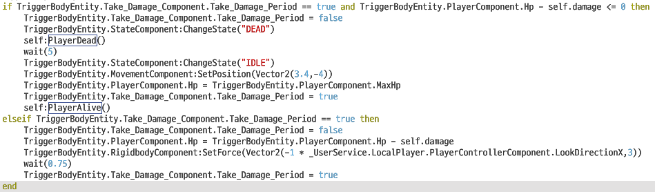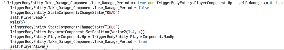다시 플레이어를 시작점으로 보내기위해 triggerbodyentity.movementcomponent:setposition(vector2(3.4,-4))로 시작점으로 보내주고 플레이어의 hp 를 maxhp로 설정