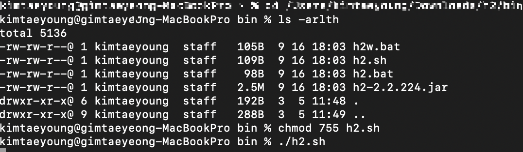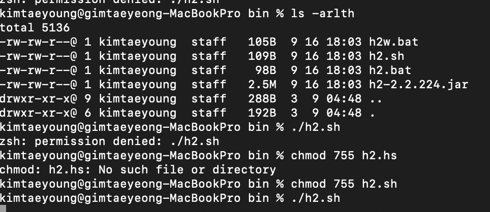 h2데이터 베이스를 사용하기에 h2를 깔아주고 폴더의 bin폴더로 들어가서 권한을 주고 h2 터미널에서 데이터 베이스를 실행시킨다