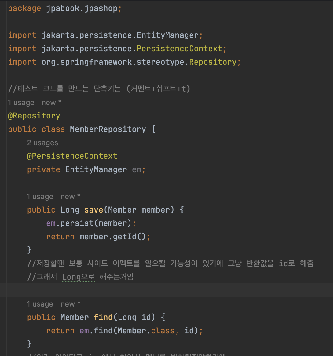 여기선 멤버 저장 및 조회를 만들었고 저장시에는 멤버의 id 값을 반환해주고 멤버 조회시에는 id값을 파라미터로 받아서 jpa에서 멤버의 id로 멤버를 찾아서 반환해준다.