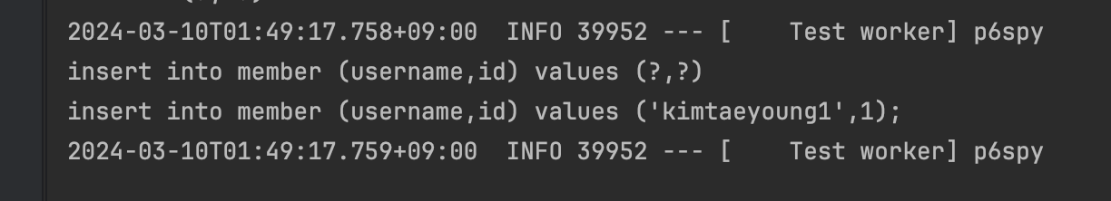 쿼리 파라미터 로그를 찍어주기 위해선 이 trace 옵션을 설정해줘야한다 그 후 테스트 케이스를 돌려보면