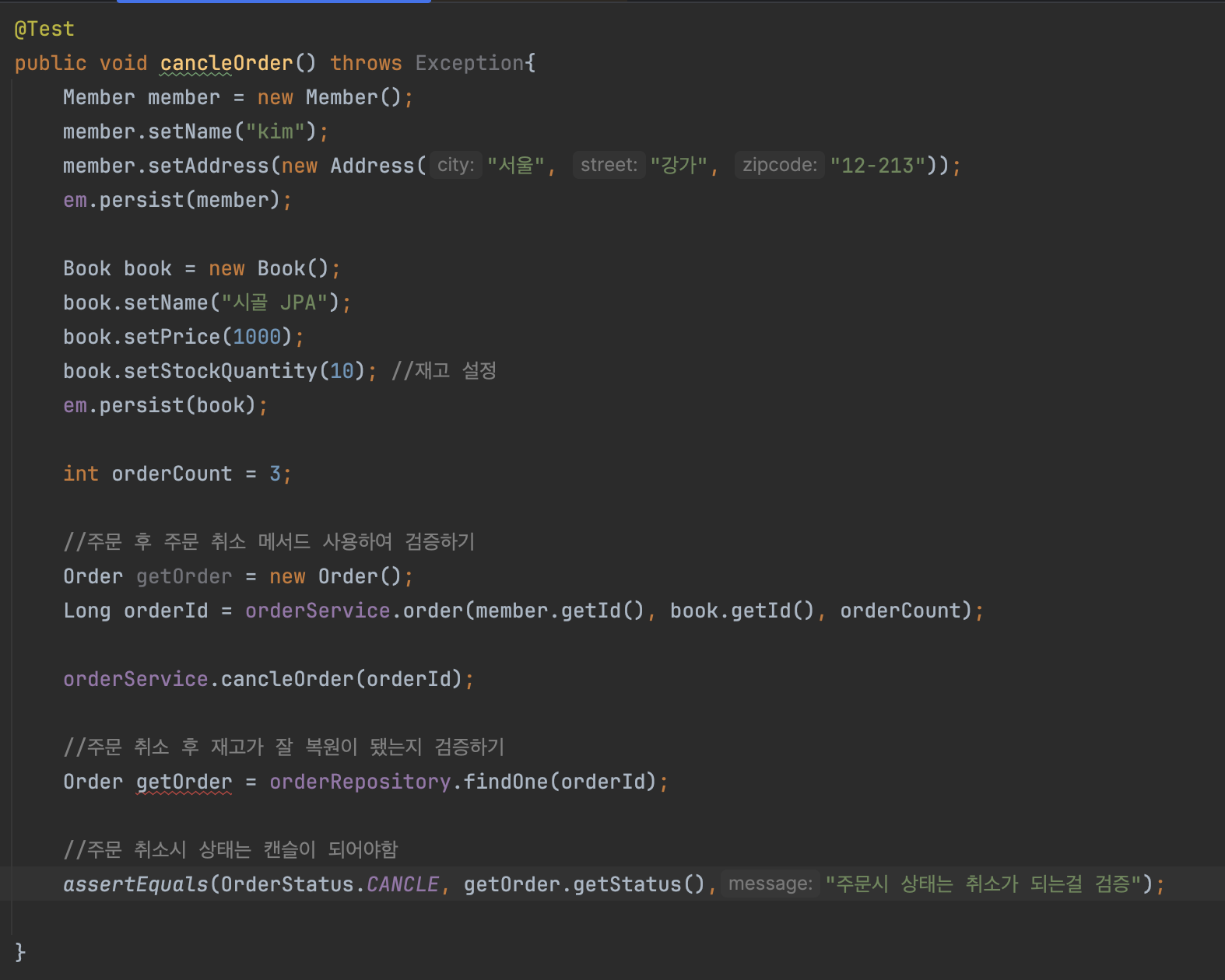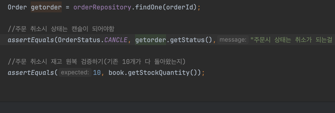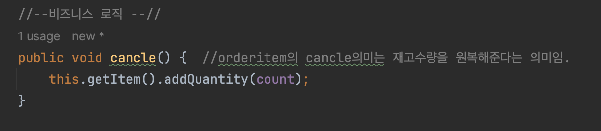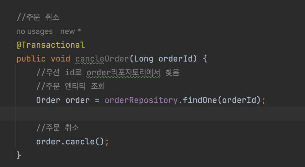주문 취소 로직에서도 동일하게 값을 cancle로 바꿔주는걸 해줬음.(알아서 JPA가 커밋 시점을 찾아서 DB업데이트를 해줌)