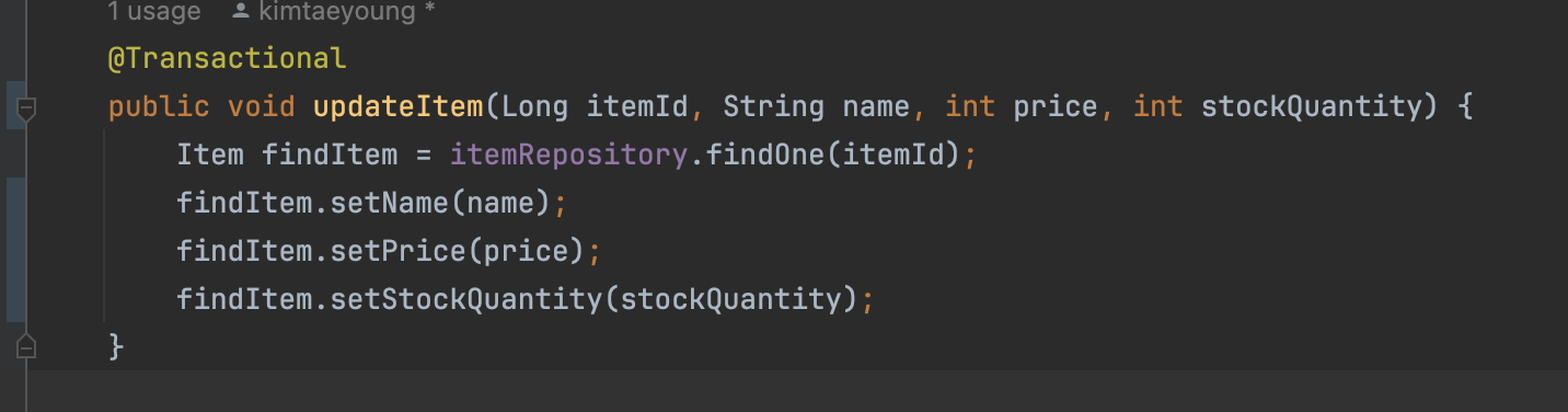 그럼 파라미터로 넘어온 book으로 값을 세팅을 다 했으면 스프링의 트렌젝셔널에 의해서 트렌젝션 커밋이 됨.
