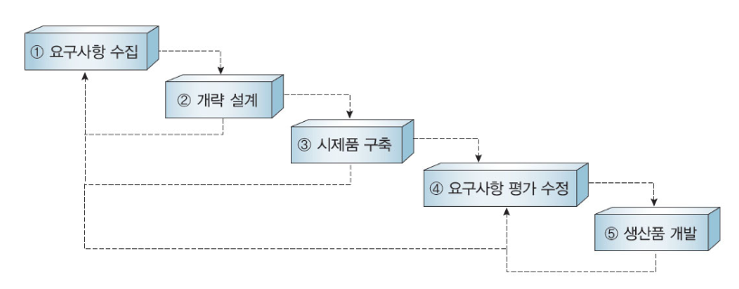 요구사항 수집, 개략 설계, 시제품 구축, 요구사항 평가 수정, 생산품 개발 단계로 이루어짐.