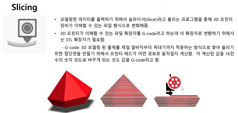 모델링한 데이터를 출력하기 위해서 슬라이서라고 불리는 프로그램을 통해 3D프린터 장비가 이해할수 있는 파일 형식으로 변화해줌.(STL파일)
