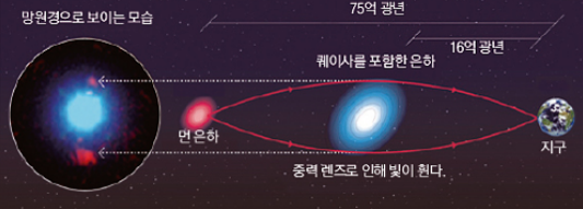 -> 빛은 직선의 경로로 움직이지만 시공간이 휘어있기 때문에 빛의 진행경로가 곡선으로 왜곡된다.
