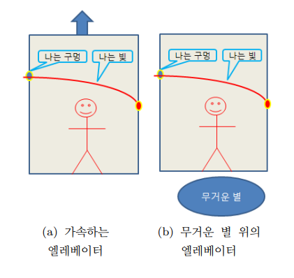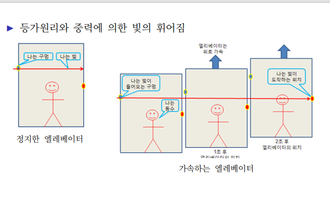 등가원리를 적용하면 중력이 미치는 엘베 안에서도 빛은 휘어져 보일것이다.
