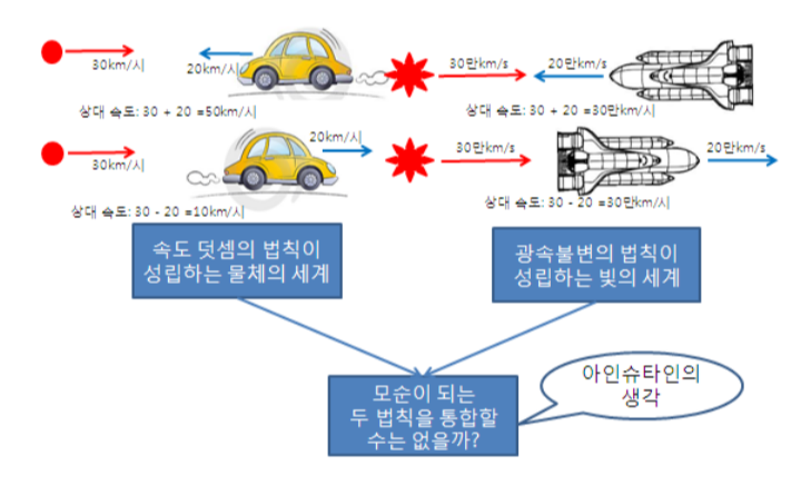 빛 속도 불변의 원리: 자유공간에서 빛의 속도는 관측자나 광원의 운동에 관계없이 항상 일정하다.