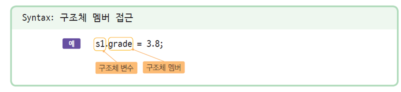 구조체에서 멤버를 접근할때에는 . 을 사용하여서 접근함